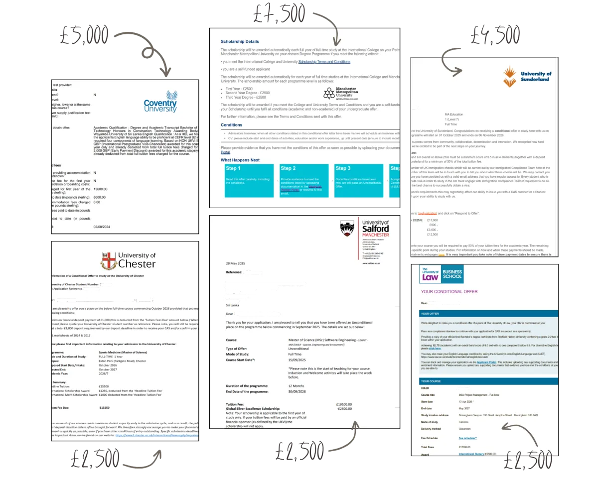 Our partner universities offer scholarships ranging from £2,500 to £5,000 (sometimes even up to £7,500) for Sri Lankan students, with higher awards in select cases. Eligibility depends on your academic and professional profile. These are not advertised widely. Part of our process is identifying every scholarship you qualify for before your application is submitted.